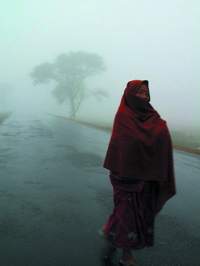释迦牟尼的诞生地蓝毗尼,一个女人在清晨的大雾中前行。