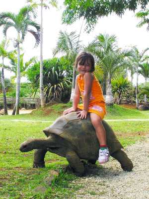 龟壳坐上去像石头 叫它们象龟真是名副其实,没亲眼见过的人很难想象这些象龟究竟有多大:它们体重通常超过250公斤,身长一米以上,远远望去,像一辆辆小坦克。这些象龟行动缓慢,性格温和,据说从不咬人。在岛上玩累了如果有幸遇见一只,可以坐在它又宽又硬的壳上,当作歇脚的板凳。 记者就曾坐过这种象龟,感觉和坐在