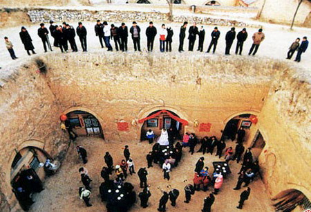 整个县境沟壑纵横,仅土沟就有七十五条,支沟、毛沟更是数不胜数,自古以来人们就用“平陆不平沟三干”的俗语来描绘它。这种特殊的自然环境和悠久的居住建造习俗,形成了这里独特的民居形式––地窨(yin,去声)院,显示了黄土高原居住民俗传承的鲜明特色。 农家的地窨院一般长宽三、四十米,深约十多米,其建造方法是,先选择一块平坦的地方,从上而下挖一个天井似的
