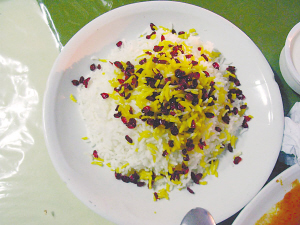 食品中到处是金* 第一次吃藏红花是在伊朗的王宫,记者发现,熟悉的大米饭上竟有一些大米是金*的,我们被告知金*的大米是被藏红花泡的水浇过的。我尝了一口,有点淡淡的清香味,很可口。 在伊朗生活久了才发现,原来不只是王宫,普通百姓家也经常在大米饭或馕上加入藏红花水。一顿饭用几根花蕊就够了,因此一克藏红花蕊能用很长时间。伊朗人对这一国宝感到很自豪。去伊朗人家里做客或在餐馆吃饭的时候,他们都会特意告诉外国人米饭中藏红花的秘密。 在糕点、糖果、奶制品、冰激凌等中藏红花的影子随处可见。伊朗市场上有一种冰糖是橘*的,它是用藏红花水浸泡后制成的。伊朗的其他国宝也和藏红花有着密切关系,比如伊朗地毯中的红色染料,就是从藏红花中提炼的。有一种开心果也用藏红花做成橘红色,与白色开心果相比有种独特的