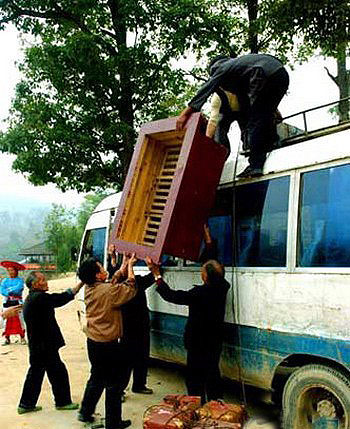奉段妹娘家送来的嫁妆 这种传统,使10月28日成为了村子里冯修文家大喜的日子。这一天,是冯修文与他的妻子奉段妹的儿子出生后的第七天,女方家将把嫁妆送到男方这边来。一辆小客车停在村外的坪里,奉段妹的亲戚