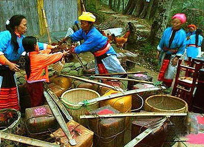 挑着嫁妆的娘家人鱼贯走上山坡,冯家村子里的邻里乡亲在山间道口上迎接着这彩色长龙般喜气洋洋的队伍。