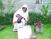咖啡壶 他们的咖啡仪式是远近闻名的。傍晚的时候,全家人围着一个小炭炉席地而坐。炭炉周围的地上铺一层特意割来或买来的青草。这是一种特殊的专用于咖啡仪式的青草。小炭炉点着的时候,要特意拣出几块冒着浓烟的白炭,在屋里每一个角落都晃一遍,然后放在炉边让它自己燃尽或熄灭。这样,在一段时间内,整个屋子或庭院就笼罩在烟雾燎绕之中。