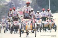 三轮车比赛 我曾多次去过金边,出门旅游、采购或办事,曾乘坐出租汽车、出租摩托车等,但用的最多的便是出租三轮车。而且我喜欢一边观赏一路秀丽的风光,一边与三轮车工人聊天,所以我对三轮车的历史、现状及三轮车工人的工作与生活有一定的了解。金边使用三轮车已有一百多年的历史了。在这之前,他们使用的交通工具主要有四轮马车和黄包车。马车有车篷,由两马拉车,是王族和达官贵人出游和办事喜欢乘坐的交通工具。黄包车是1820年越南人带入金边的。这种车完全是靠人力拉动,车手是越南人。柬埔寨人怕辛苦不干。1863年法国统治柬埔寨后,一位名叫考比德的法国商人把三轮车带入了柬埔寨。当时他自己当老板,既出售又出租