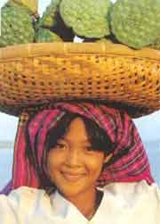 头上包着水布的卖货女童 大家可能都看到过柬埔寨人的照片,几乎每人身上都带着一块花格布。那种花格布,柬埔寨语称做“格罗麻”,译成中文叫做“水布”。水布是柬埔寨人日常生活中必不可少的用品。在柬埔寨,无论男女老幼都随身带着一块水布,有的盘裹在头顶,有的围在脖子上,有的搭在肩膀上,有的系于腰间……水布是用棉纱或蚕丝织成的,大小像一条小床单。水布一般用几种不同颜色的线织成方格图案,有的留出一段线头编成穗状,有的则直接收口。 水布的用途很广,下面