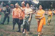 “麦霍”拉那列夫人播撒种子 极其隆重。有关部门在节前一个星期就开始四处奔忙,物色“神牛”,神牛要挑选健壮的三对公牛充当,同时准备好三张耕犁,每对神牛拉一张犁。柬埔寨农民使用的犁只有一个手扶柄,而