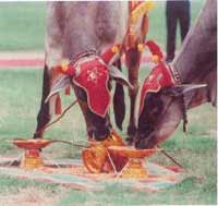 六月下弦初四,人们簇拥着“御耕王”和“麦霍”到“圣田”西北角的圆亭子里祭拜湿婆神像,“巴古”吹三遍海螺,表示御耕节仪式正式开始,“御耕王”扶犁出发。中间一张犁由“御耕王”扶持,走在中间,前后两张犁由两名政府官员掌握。在第三张犁的后面,“麦霍”和一群身穿民族服装的少女把最优良的稻种向左右撒播,口中念念有词,祈祷农业丰收。每耕作一圈,“巴古”便吹海螺为号。绕场三圈后,耕作仪式即告结束。然后,犁田队伍走到东面供奉毗湿奴的亭子,把披红挂绿的神牛从犁上解下来。