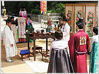 婚姻对韩国人来说是人生中的一大重要仪式。虽然有统计显示近代韩国的离婚率激增,但离婚对当事人及双方各自的家人来说还是一件不太光彩的事情。韩国现在的婚礼方式同以往有所不同: 身着白色婚纱和新娘和身着燕尾服的新郎在婚礼厅或教堂按西方仪式举办典礼后,再转移到名为“币帛室”的房间,换上华丽的传统婚礼服饰进行传统的结婚典礼。 (币帛,可理解为韩国的一种传统,指婚礼时新郎新娘向男方家长及亲