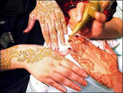 ![]() 新娘手上画出的美丽花纹 巴基斯坦的婚礼通常在新娘家举行,但现代的婚礼已经不那么严格了,塔蒂姆的婚礼就在他家举行。与其他一些伊斯兰国家一样,巴基斯坦新娘要在婚礼的前5天进行一次正式的沐浴。沐浴之后,由女性至亲好友为其梳妆打扮,并在手上和脚上染指甲花油。她们还用一种特制的褐色树脂油在手背、手腕和脚背、脚腕上绘出美丽的花纹,来表达自己喜悦的心情。记者刚到巴基斯坦时还以为这是在文身,