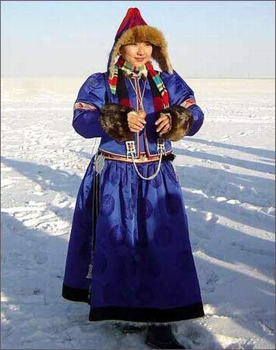 ![]() 鄂温克少女服饰 在大兴安岭西北麓、额尔古纳河右岸的原始森林中,是鄂温克驯鹿人的聚居地。他们是鄂温克族最神秘的一个支系,是一个鲜为人知的少数民族部落。他们主要靠放养驯鹿和狩猎为生,整年游荡在大兴安岭原始森林中。 每逢节日,他们会像打扮自家孩子那样为驯鹿梳妆打扮。驯鹿还是鄂温克人嫁娶的聘礼,举行婚礼时,新郎新娘要牵着驯鹿在新房周围转几圈,表示人丁兴旺、驯鹿健壮。 迁徙是鄂温克猎民的一件大事,迁徙前,猎民先把驯鹿和准备搬迁的物品准备好,迁徙开始后,由各家各户的妇女牵着自家驮物品的驯鹿组成一个长队,最前面有两名年轻力壮的妇女负责引路,驮妇孺的驯鹿走在队伍的最后边,其他驯鹿便自动尾随左右。