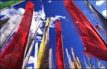 不丹人的服装体现了他们崇尚悠闲的生活态度。当地朋友对我说,由于长期受佛教教义的熏陶,宽厚待人、与世无争的思想早已渗入当地人的生活中。锁和钥匙在不丹几乎已无用武之地,这是因为不丹的社会治安良好,犯罪率极低,人们外出很少锁门。 与世无争的性格并不表明国民孱弱。不丹森林茂密,黑熊、雪豹等猛兽多,当地男子的怀中都少不了匕首。而且,上至国王大臣,下至平民百姓,个个都是射箭高手,一些不丹高级官员上班时甚至还随身佩带长剑。 经幡印成五彩 ![]() 无论是山边路旁,还是房顶门前,不丹各地随处可见一片片迎风招展的五彩旗,场面蔚为大观,古朴中透出几分神秘和