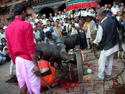 ![]() 如果依照习俗,应当用非常昂贵的水牛做供品,但现在祭拜者通常以活羊做祭品,而家境贫寒的人们则拿活的鸡鸭代替。不论是羊或是鸡鸭,都必须是公的。在人们的帮助下,屠者当场宰杀祭品,女子祈祷许愿并手捧其鲜血喷到卡里女神像上。人们认为,卡里女神喜欢饮用鲜血,此举可以使其高兴从而帮助祭拜者达成愿望。祭拜之后,人们则把羊肉或鸡肉带回家中分食,因为他们相信吃了这些带有灵气的“圣肉”可以带来福气。 国王每年都去祭拜 &