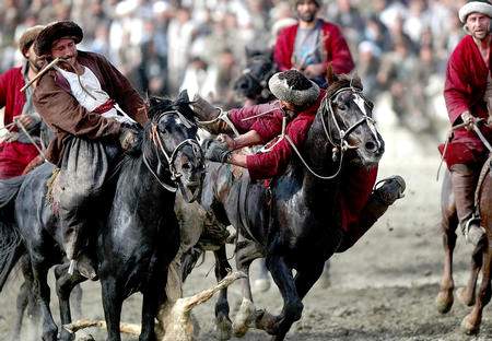 两名阿富汗选手在喀布尔举行的一场叼羊比赛中争夺山羊在比赛的前一天,组织者会杀死一头闪羊,并割下它的脑袋、内脏和后背的皮肤,并将其身体在盐水中浸泡一整夜,使畜体比正常情况下沉重许多,通常要达到75磅左右。这样