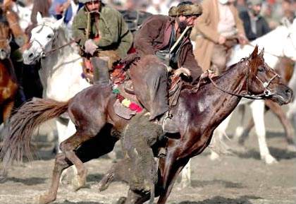 一名阿富汗选手在喀布尔举行的一场叼羊比赛中争得一只山羊伴随着叼羊比赛热闹、激烈的进行,场下的观众也变得越发狂热。他们不顾警察的驱赶、呵斥,冒着被飞奔而来的赛马踢倒的危险,