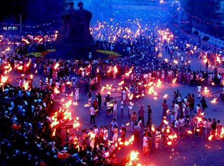 ![]() 彝族,中国四川西部一个崇拜火的民族。人口150多万,居住在6万余平方公里的大小凉山。彝族人民繁衍生息在这片有悠久历史、古老文化、神奇传说的土地上,到今天还保留着最古朴、最浓烈、最独特的文化传统。火的民族、火的子孙,祖祖辈辈崇火、尚火、恋火的彝族先民认为火是生命的起点,火也是生命的终结。 火把节是凉山彝族一年一度传统的重大祭祀性节日。但最初不过是彝族先民用打火把来驱虫辟邪、企盼丰收的民间习俗。在征服自然和改造自然的历史进程中,这种习俗逐步演变成今天的民间文化体育节日。火把节历史久远,自汉唐起,已沿袭了一千多年。有关火把节的起源,记载和传说甚多,内容丰富,各具特色。 其中较为普遍的说法是:在远古的时候,天上的大力神思惹阿比和地上的大力士俄体拉巴比赛摔跤。思惹阿比战败后上天拨弄是非,天神大怒,于是撒下众多害虫糟蹋庄稼,粮食颗粒无收,民不聊生。于是,英雄俄体拉巴率领人们点燃火把驱虫除害,最终战胜了天神。另一种传说:天神恩梯古兹派喽罗到人间收取苛捐杂