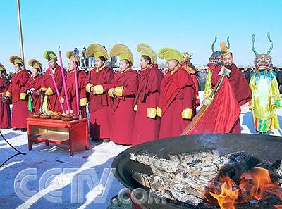 ![]() 当主持人宣布“醒网、祭湖仪式开始”时,鼓乐队奏乐,表演人员按诵经喇嘛、跳查玛舞的演员、渔把头、蒙古族姑娘、蒙古族青年渔工分乘马爬犁的先后顺序向场内行进,喇嘛摇动法轮等佛具,跳查玛舞的跳舞、渔把头、蒙古族姑娘、蒙古族青年随后,在鼓乐声中直接来到冰洞旁,渔工列一横排站在马拉爬犁队伍前。喇嘛先将怀抱的供品逐个递给住持,住持按次序将供品摆