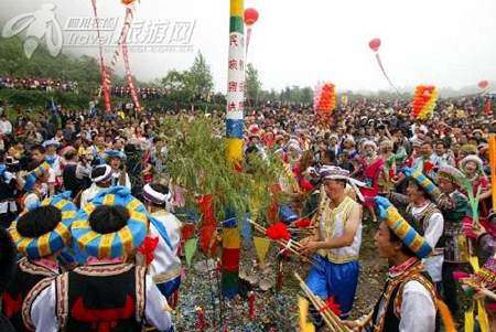 ![]() 节日第一天上午,要举行立花竿仪式。就是在山坡中央竖起一根系着松柏枝条和鲜花彩旗的花杆,作为采花山的标志。立花杆由年长者主持,花杆定好后年长者向人们敬酒祝福,随即锣鼓声,鞭炮声齐鸣,芦笙悠悠,在人们欢笑声中,踩山活动就拉开了序幕。男女老少在悠扬的芦笙音乐中,跳起蹬脚舞,耍狮灯等,一派欢腾的景象。吹