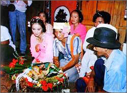 ![]() 鸡肉为媒 傣家青年男女社交恋爱,傣语称为“约骚”。当地汉族称为“串姑娘”。傣历新年那一天,傣家竹楼里到处可闻一片杀鸡声,鸡烧好后,便见姑娘穿上盛装,把鸡肉拿到集市上去卖,等候自己喜欢的小伙子来买。兴高采烈的小伙子纷纷前来问价,如果姑娘说:“吃了再称。