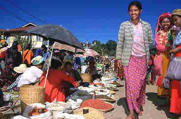 ![]() 黄香粉、纯烟草 集市采风乐趣多 我们首先就去赶这热闹的集市,集市里的物品对我们来说都是稀奇罕见的,像那锯成一节节卖的木头,第一次看到还以为是卖给人当柴火的,其实是一种黄香树(MureaExotica),也就是缅甸女人脸上涂的那一圈圈黄粉的来源。缅甸人家里都有座小石磨,就是用来磨这种树皮的,磨成粉状再沾水擦在脸上可防晒去斑,这也是她们的习俗,阿英说小时候曾因未擦黄香粉去上学而被老师处罚呢! 市集里还有他们自制的纸卷烟、叶卷烟,缅甸的方头雪茄Cheroots大部分是此地做的,这里的烟草没有加化学品很纯,可以慢慢的抽上数个小时,是一种享受。其他还有炸蟋蟀、炸橡树虫,