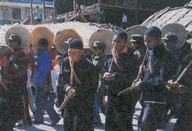 ![]() 澜沧县拉祜族太阳神庙,建在背东向西的山坡上,除了在右头顶上留着智慧之辫的祭司能进去之外,任何人严禁人内。 祭太阳神庙在立夏日,拉祜人说,这是一年中太阳阳光最多的一天。凌晨,妇女们手持竹箩,内装爆米花,围着寨心桩边跳过舞,敬献神灵,祈祷年丰。跳完,男人们敲着锣鼓,手持长刀,列队向山坡行进,先到太阳神庙下方的祖庙里烧香磕头祭祀祖灵,然后到太阳神庙,列队庙旁,举行祭祀。祭司念咒,人们边唱过歌,边撒爆米花。此时太阳偏西,阳光直射神庙,金色的阳光、雪白的米花映衬着人们肃穆的面孔。直到祭司念完咒语祷词,人们把爆米花全部撤完,太阳落