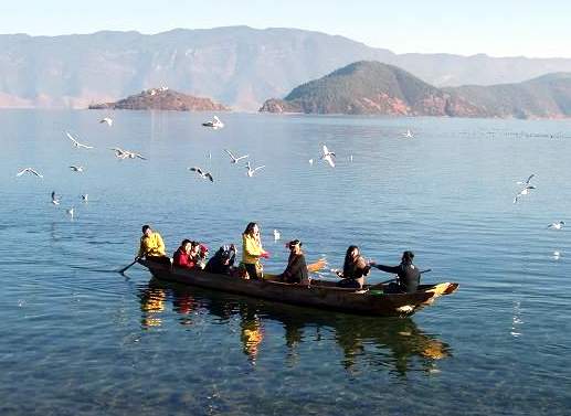 时间:2026/3/30 19:54:40来源:不详 ![]() 世居在泸沽湖畔的摩梭人,至今仍保留着母系家庭的文化习俗,母亲生下的儿女永远陪伴在母亲身边,男不娶、女不嫁,走婚实现着人类的传承。在摩梭人的家庭中,女性有着崇高的地位。所以,泸沽湖也被称为“女儿湖”、“母亲湖”。 我们乘上摩梭女的“猪槽船”,荡漾在清澈碧波的湖面上,身着漂亮的摩梭女孩,一面划桨,一面唱着优美的歌:“不论你从那里来,来了就是朋友就是朋友,湖水清清篝火红,苏理玛酒情意浓,我敬客人一杯酒,多少话儿在酒中,啊哈巴啦,玛达米——”歌声在湖面上飘荡,此起彼伏,我们陶醉在这大自然造化的音乐厅中。 和着优美的歌声荡舟,我们一边欣赏湖上的美景、一边随意地闲聊着。唱歌的女孩,一个叫纳姬,一个叫库姆。他们风趣地介绍说:“我们的名字很好记,一个是‘垃圾’,一个是‘枯木’”。逗得游客都乐了,这一乐,很快就拉近了彼此之间的距离,你一言我一语,邀请她们继续唱歌。 俩姐妹又高兴地歌颂起了风景秀美的泸沽湖:“美丽的泸沽湖迎来朝霞,雄伟的狮子山白云缭绕,善良的阿妈为何这样高兴?是因为女儿已经长大成人,女儿长大好像一支花约,开在高山迎接太阳;”遥望湖尽头高高屹立的狮子山,它雄伟挺拔,水天相连,青山滴翠,白云缭绕。 我突然想起“山水共长天一色”的诗句来。纳姬告诉我们,没有云雾缭绕的时候,它整个就一头逼真的雄狮。她话锋一转:“再厉害的雄狮投进女儿湖的怀抱,也会变得温顺、善良。”船上又是一阵畅快的笑声。
