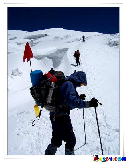 从高C3出发冲顶的时候非常冷,在冲锋衣上套了羽绒服。后来太阳出来了,暖了起了。由于在行进过程中没风,11点的时候我脱下了羽绒。感谢慕士塔格阿塔给了我们好天气。 在峰顶的平台上