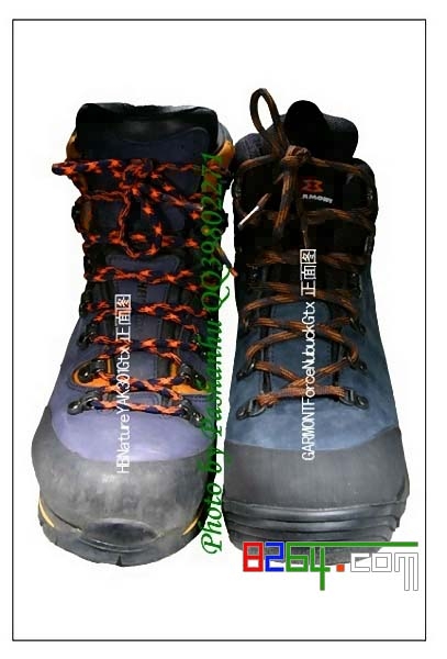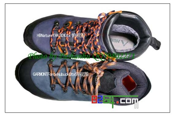 鞋头内部空间:感觉HBNature YAK301 Gtx的比GARMONT Force Nubuck Gtx的稍小,脚趾的活动余地GARMONT Force Nubuck Gtx的比HBNature YAK301 Gtx的大,穿着比较舒服,这从图中可看出来,GARMONT Force Nubuck Gtx的鞋面较宽。另外,两款鞋的鞋带扣的设计也有所不同:感觉HBNature YAK301 Gtx的比GARMONT Force Nubuck Gtx的设计要好。前者的鞋带与鞋带扣的接触面积大,更有效地防止鞋带磨损。见图: