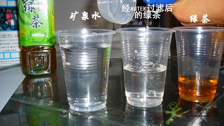 第三步:将AUTEK壶中的绿茶以挤压的方式倒入空塑料杯中,这时可以观察到从AUTEK 壶嘴中流出来的绿茶和清水一样,透明,无色。并且口感已经和绿茶完全不同了,有点甜,几乎没有绿茶的味道,跟糖水一样,(AUTEK水壶不适用于含盐含糖的水)