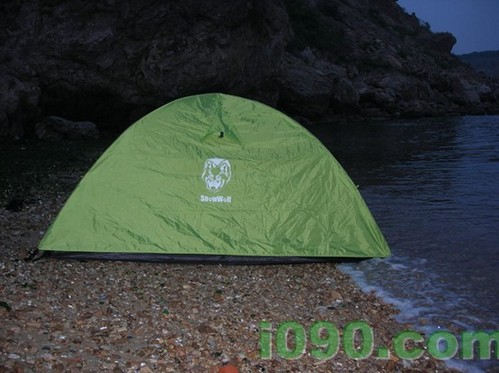 说过了重量,下面说说另一大亮点——防水。这款帐篷的帐底采用采用SnowWolf冲锋衣一样的防水透湿面料,所以防水可以达到10000,当然了这都是厂家提供的数据,在没有实际使用之前都要表示小小的质疑了,实践出真知嘛。所以就把帐篷拿到海边去了,把帐篷的一个边放到海水里面,另一半留在岸边(要是全放水里,害怕被潮水带走而且会从帐篷门里面进水),就这么静置了一个小时,将帐篷拿上来打开帐门,帐底除了看着有点印了之外没有漏水的迹象。初步看来防水还可以,但还需要进一步确认。