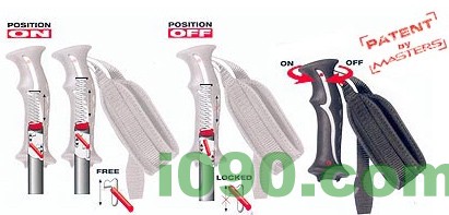 最令人称道的就是其独有的Kompressor®减震及锁定系统。其特点就是减震的弹簧不是像其他杖放在铝管里,而是在手柄里面,并且在握把上有锁定系统,可以方便快捷的开启减震功能。
