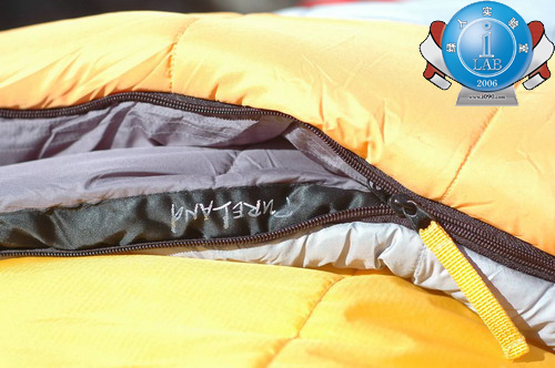 较柔和,暖色系的睡袋给人的第一感觉就是舒适,摸了一下手感确实很轻柔,晚上打头灯找水喝的时候发现还具有夜光效果,不错。值得一提的是拉链设计是不同尺寸和不同方向开口拉链,可对拼成为情侣睡袋。这个设计我最早是在FERRINO睡袋上面看过,现在好象被越来越多的厂家采用,看来是个流行趋势。沿着拉链开合位置,厂家做了一道边,作用在体验中感觉是防止拉练夹到里料的。填充厂家采用的是四孔棉,在这里不多说了。脚部设有一个外袋仓,这个设计比较独到,说来惭愧,一开始徒行还不知道干嘛使的。说说做工方面,魔术贴裁的比较匀称,扎线也比较工整,PURELAND对细节的注重在RHINO身上又一次得到验证。