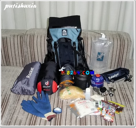 药品:同伴都有带,就不重复带了。 Petzl Zipka超轻型头灯,连电池重65g;垃圾袋数个,10g;手套1对,62g,这几样东西放顶袋里。 以上合计5884g,Granite Gear Wisp自重670g,全重6554g. 所有的装备都内置无*。 装包前