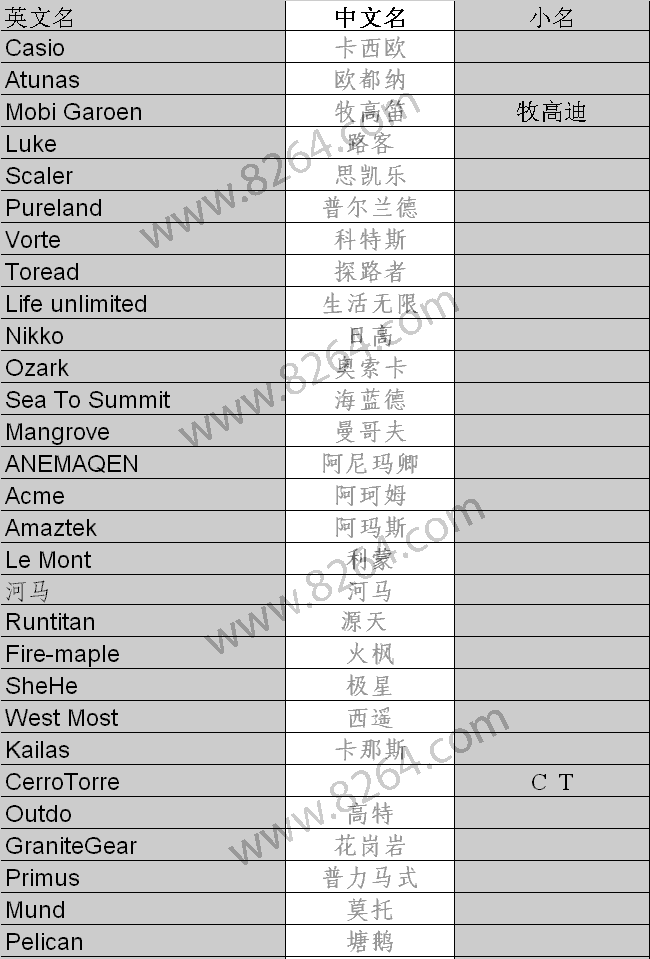 户外资料网从目前已收集国内市场可见到的160多个品牌中找到有官方中文名称或者约定俗称的90个品牌。收集整理提供给大家。