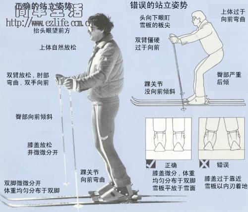 在滑雪教练或工作人员帮助下选用合适自己的滑雪靴(自己平时的尺码即可)、滑雪板、滑雪杖(参见滑雪器材页面),在滑雪场的初级练习场先做热身活动。 很多初学者穿上滑雪靴会觉得双脚被箍的很紧,宁愿脚在里面松快一些,到底怎样的滑雪靴合适呢?正确的选择是:合适的靴子的应该是让你的胫骨、脚后跟、脚面被紧握而不感压迫,踝关节要能弯曲,脚趾能活动抓地,总之要让靴子和脚成为一个整体,因为滑雪过程中滑雪者主要通过滑雪板控制速度,没有合脚的靴子就无法有效做出各种动作。 切记不要为了舒服而让你的脚在靴子里晃悠,那样可能会扭伤脚。 穿雪靴在雪地行走时步子适中,用后跟先着地