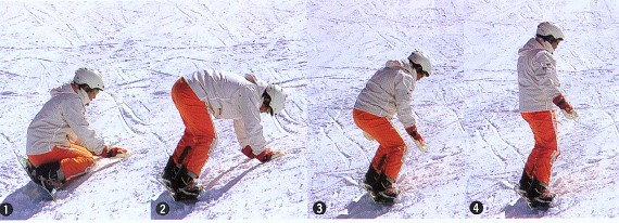 1. 臀部先着地 (臀部一定要穿戴护具)。 2. 依臀、腰、手的顺序,渐次将力量散去。 3. 即便穿戴安全帽,也不要让头部直接撞击雪面! 面山 (toe side) 的站立法
