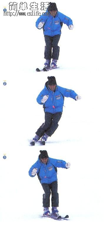 在滑雪转弯动作中,上半身的转动愈小,那在重心变换时的稳定度愈高。 在小回转 (short turn)动作中,配合快速的重心变换,上半身几乎是没有晃动的。如下图所示;