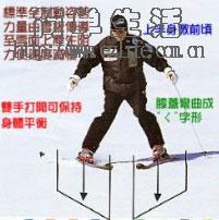内八字的全制动是所以初学滑雪者必练的动作,藉由滑雪板的内关,造成雪板与雪面的第一类接触以产生阻力。很多初学者都觉得全制动姿势是很不符合人体力学,其实主要是因为身体僵硬才会造成关节错误扭转;祗要能保持轻
