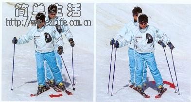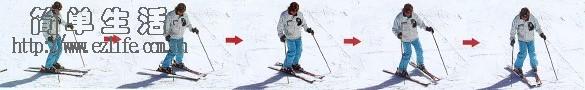 在斜坡上的方向变换以踢转为主,在平地的方向变换就简单多了! 图右为以雪板前端为原心,移动雪板后端的方向变换。