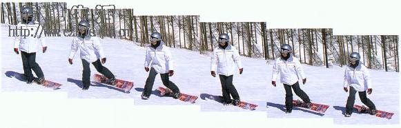 1. 穿滑板的脚置于后,以脚趾侧的钢边卡住雪面。 2. 和走路一般,两脚交互支撑。 3. 不要走太快,以免滑板和脚互撞。