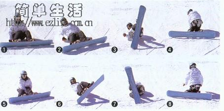 1. 上半身躺下用腰力转动雪板 (步骤1-4,从面谷转为面山)。 2. 如果腰力不够,可以双手抱住单脚大腿部位,以被抱住的脚为主,以手力协助转动滑板(步骤5-8,从面谷转为面山)。 跳转之方向变换