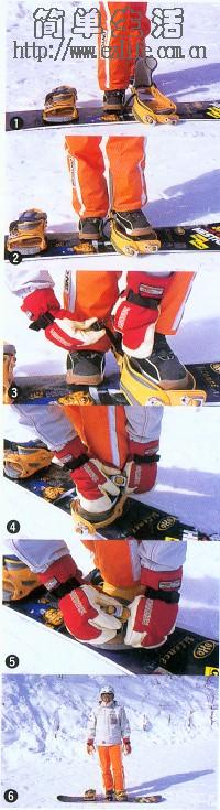 1. 以右脚 (后脚) 踩住滑板,以固定滑板。 2. 将左脚 (前脚) 插入鞋套 (binding) 中,记得先将雪鞋下的积雪先清干净。 3. 鞋套上有二条的快扣,将