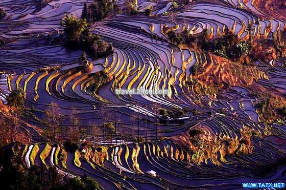 摄影者常去的地方 →坝达 拍夕阳最合适,去过三次,但未碰到云雾。 →多依树 拍朝霞的绝佳之地,在这里等了7个清晨,4天有阳光,无云雾;两天云雾太大,10米外什么都看不见;惟一一天有云雾涌动。云雾是沿着逐渐升高的梯田匍匐而来的,有时恰好形成一道屏障,把远处多余的黑暗遮挡了。 不知什么缘故,越聚越浓的云雾,总不能把持太久,不一会儿就变稀了,给冲散了,甚至还退回谷底。然而,过了一阵子,它又能从头再来。 初春正是梯田采风的最佳季节,一山山梯田灌满了水,阳光洒在水面,层层梯田像一面面大小不一的镜子镶嵌在大山上,放射出粼粼波光。我们由近及远顺河谷看去,两面山坡的波光就像两壁一望无际的立体海洋,撑起浑厚凝重的一线蓝天。 摄影者常去的地方 →坝达 拍夕阳最合适,去过三次,但未碰到云雾。 →多依树 拍朝霞的绝佳之地,在这里等了7个清晨,4天有阳光,无云雾;两天云雾太大,10米外什么都看不见;惟一一天有云雾涌动。云雾是沿着逐渐升高的梯