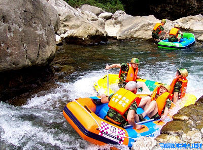 漂流的河段不同,可选择的工具也不同。一般说,橡皮筏适用范围最广,也最普遍、最常用;小木船适用于河道较直、少弯道礁石的河段;竹排则适用于风平浪静的河段。 橡皮筏的适应性非常强,即使遭遇落差较大的瀑布或是险峻的河谷,也几乎总能化险为夷。因为橡皮材料柔韧性能好,又有充气囊可以柔克刚,一般的礁石奈何不得,一般也不用游客操心,漂流过程中自有舵工负责,舵工的主要任务就是把握好方向和平衡,遇到急流险滩和礁