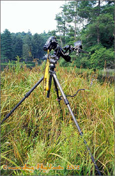 2、使用稳定的三脚架 微距摄影一般都需要比较慢的速度。以我们熟悉的阳光16法则为例,该法则适用于晴朗天气下无穷远合焦的情况。对于微距摄影来说,当镜头合焦在比较近的距离时,光线在镜头延伸筒内有一定的损失,所以这个法则要修正为“阳光11法则”。也就是说:在晴朗的阳光下,在拍摄充分照明的近物时,对应于f11的光圈,速度应为1/ISO。对于100度的胶片来说,上述情况下,应该使用1/125的速度。但是大多数情况下,为了获得均匀、细致的照片,拍摄微距应该尽量避免强烈的阳光直射,拍摄的时间大多为清晨和傍晚,多云的天气是最佳选择。比较讲究的摄影师,如果必须在高角度的太阳光下进行拍摄,则有意使用柔光板、遮光伞等设备进行遮挡。何况很多情况下,为了获得更高的放大倍率及特殊效果,还会使用一些额外的微距附件,比如延伸筒、增距镜或者琥珀镜、偏振镜等等。这时实现正常曝光需要的速度就大大降低,根据我的经验,这个速度通常在1/30-4”之间。如果你偏爱使用低感光度的胶片,就要面临更大的挑战。不知道在座的有几位有信心以1/8”手持获得高质量的微距片子,反正我不行。所以,三脚架对于微距摄影来说绝对是必须的。在拍摄了一段时间的微距以后,我现在基本上是没有三脚架就不按快门的。 理论上讲,三脚架越重越好。对于拍摄微距来说,我们必须在重量和便携性上做一个妥协。所以你能抗得动的最重的三脚架是对于你来说最好的选择。如果三脚架本身的重量还不够稳固,在使用的时候还可以附加一些额外的重物,比如石块、摄影包等等。不过必须保