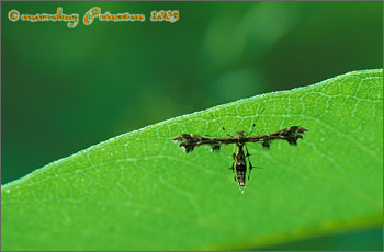 还有一个解决办法是使用连拍功能,前面说过,微风总会有瞬间的宁静的时刻,同样道理,它们也会在瞬间毫无征兆地来临。连拍通常能够保证一个系列里至少有一张是满意的。我知道你肯定会心疼胶片,不过如果你象我这样每次花半个小时摆好一个姿势然后再拍摄,大概就不太在乎几张胶片了更何况,保留一些拷贝可以用于出版、投稿等等,原始的幻灯片效果远好于复制品和打印片。 (2) 正确选择焦平面; 我们都知道微距摄影的景深非常小,无论镜头焦距是多大,在1:2的放大倍率下,f22对应的景深大约只有6mm;而1:1时f22对应的景深只有2mm。所以在拍摄时应该尽量仔细选择焦平面的位置,把需要表现的细节尽量放在一个平面内,并使这个平面与胶片平面(相机后背)平行――请注意“焦平面”和“胶平面”的区别。比较简单的情况,比如拍摄蝴蝶,如果蝴蝶的翅膀是并在背上的,那么最保险的办法是把机背调整至与翅面平行,这种情况下即使f8、甚至f5.6的光圈也可以拥有足够的景深(视具体放大倍率而定)。 ![]() 精确的选择焦平面是获得锐利图像的前提 焦平面的选择实际上应该是拍摄过程中耗时最多的一个过程,经过精心的选择,图片的质量可以得到明显的提高。当然,焦平面的选择也没有什么一定之规,蝴蝶也可以从头部正面、侧面、甚至尾部拍摄,这里的准则是:一定要把你要表现内容尽量放在一个平面内,拍摄时要做到心中有数,哪些东西在胶片上是清楚