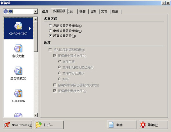 1、CD-ROM(ISO) 这种光盘类型是最常见和最常用的数据光盘,就是在电脑硬盘里的什么东西都可以刻进光盘里,一言以蔽之就是把光盘当做小硬盘来使用,读取光盘内容就像读取硬盘里的内容一样容易。如图 ![]() 上图中在“多重区段”设置中有三个选项,其代表的意思分别为:启动光盘的多重区段功能,第二次把数据刻录到有多重区段的光盘,不启动光盘的多重区段功能。其中选中第一项就是在第一次刻盘里把光盘初始化成区段光盘,意思就是可以多次往未满的光盘里写入数据,第一次写入一部分数据,下次如果还有数据可以继续往原光盘里写入,第二次往光盘里写入数据时就得选第二个选项了,这样系统会把原多重区段光盘里的内容以灰色的形式显示出来,并会告之你光盘还剩多少空间可供刻录。第三个选项就是让光盘只能刻一次,不管你光盘满不满都不能再次向光盘里写入任何数据! 切换到“刻录”设置选项,可选择刻录速度及刻录方式等,如图 ![]() 点击“新建”按钮,弹出界面,如图 |
