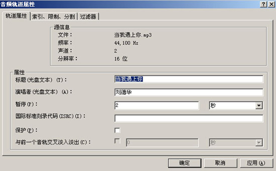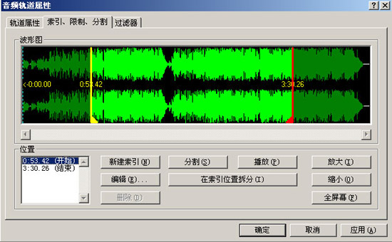 切换到“索引、限制、分割”界面还可以对所选定的音乐进行编辑,如从什么时候开始什么时候结束等。 |