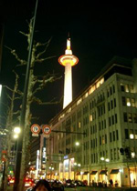 矗立在京都站前的京都塔建于1964年,高131米,呈蜡烛状,是眺望京都的好场所。不采用钢骨架方式,改采钢铁环堆积方式建成。京都的街道风貌一览无遗,四周神社寺庙以及东山36峰尽收眼底。现在,京都塔已经成为京都大门口的象征性建筑,从这里眺望京都的夜景,别有一番情趣。