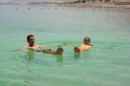 死海地区气候酷热(年平均气温25℃),水蒸发量极大(夏天每小时平均蒸发1英寸的水),造成死海水面上总是弥漫和飘散着一层柔柔的水雾,而死海的海水碧绿,水面平静如镜,沉寂无声,没有一丝波纹,两边的山岩清清楚楚倒映在水中,给海水投上一抹嫩红。