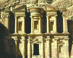 在近一公里狭窄阴暗的峡谷中转过最后一个弯曲之后,佩特拉古城最壮观的景象———卡兹尼神殿就闯进眼睛。 卡兹尼神殿就是《最后的十字军战士》里秘藏耶稣圣杯的地方,雕刻精美的廊柱和拱顶让人惊叹古人的奢华。据说这里是当时国王停放棺木的地方,确曾收藏过很多金银珠宝。当然寻宝这种美事只能在电影里过过瘾。如今的神庙里空空如也,只有门口穿着阿拉伯传统*的保安笑眯眯地为游客摆“甫士”。